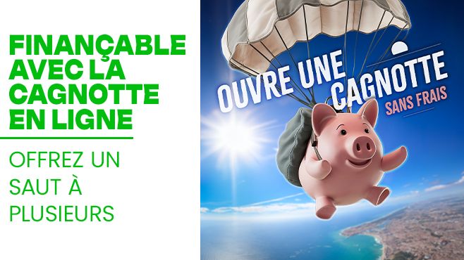 Si l’e-billet ne vous suffit pas, optez pour la Box ECO. Un coffret soigné, pensé par des parachutistes, sans frais cachés ni mauvaise surprise, valable sur des créneaux du lundi au vendredi – c’est aussi ce qui rend son prix si malin. Même saut à 4000 m, même équipe, mêmes sensations… au meilleur tarif semaine.